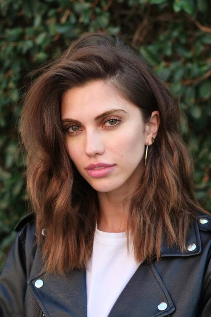 This hairstyle combines loose, tousled waves with a slightly layered cut, creating a natural, voluminous look.