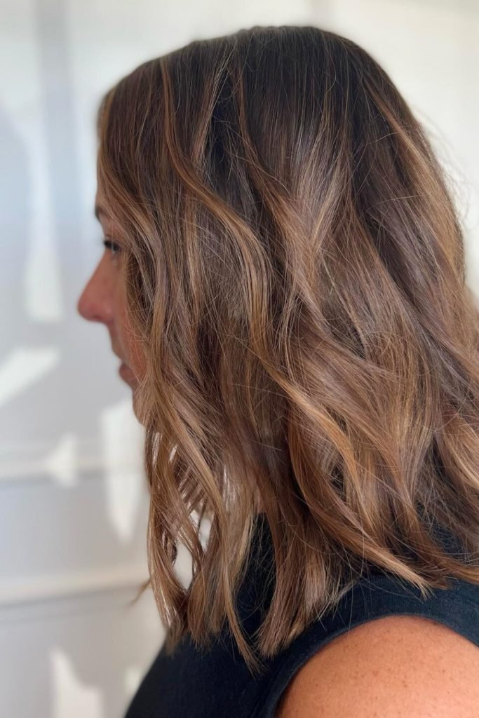 The sun-kissed textured lob combines warm brown hues with subtle golden highlights, creating a radiant and natural look.