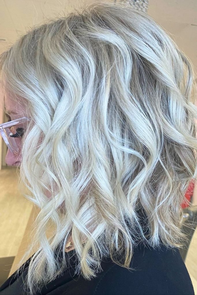The tousled platinum textured lob stands out with its bright, striking color and effortless waves.
