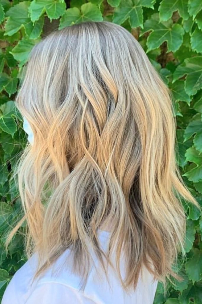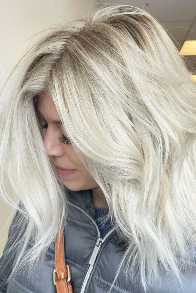 The ash-blonde textured lob combines dark roots with cool, platinum-blonde ends for a striking contrast. This hairstyle features loose, soft waves that create a natural, tousled look.