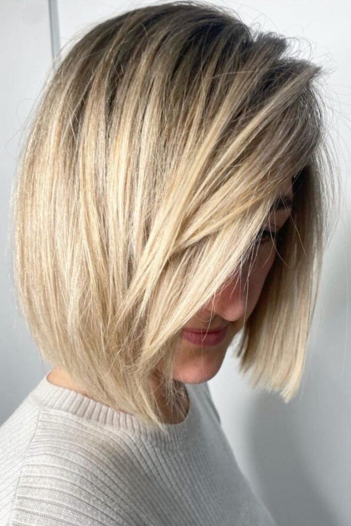 The sleek blonde textured lob is a sophisticated hairstyle that features straight, clean lines with a slight undercut for added texture.