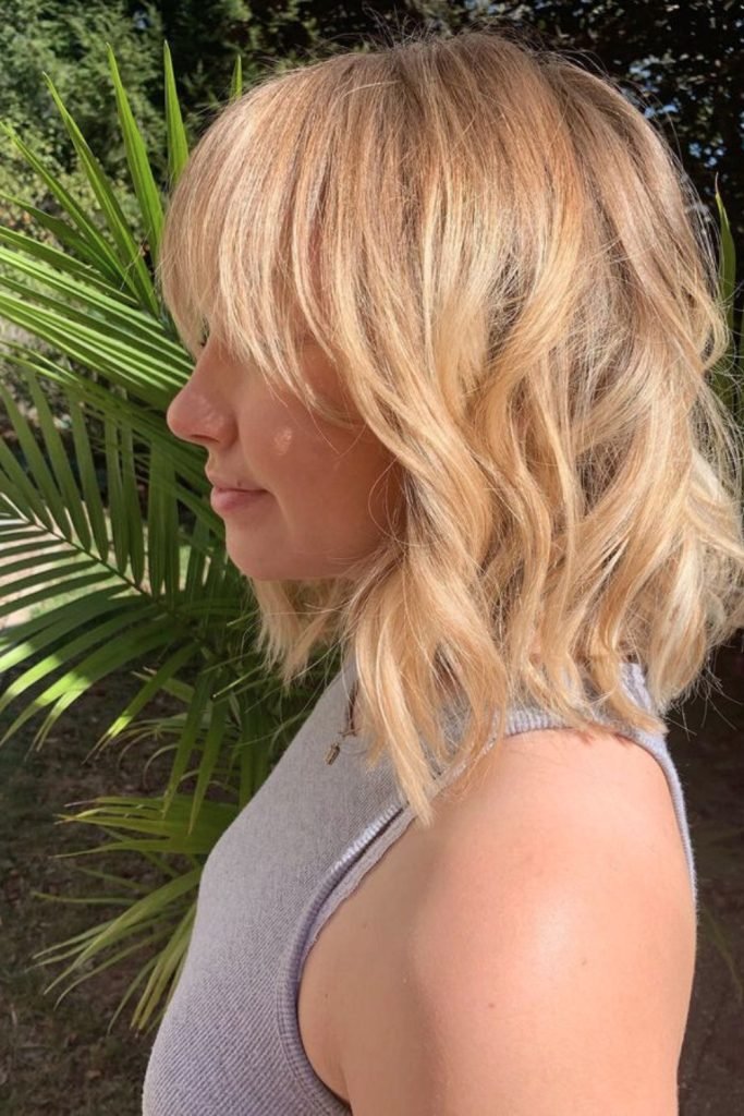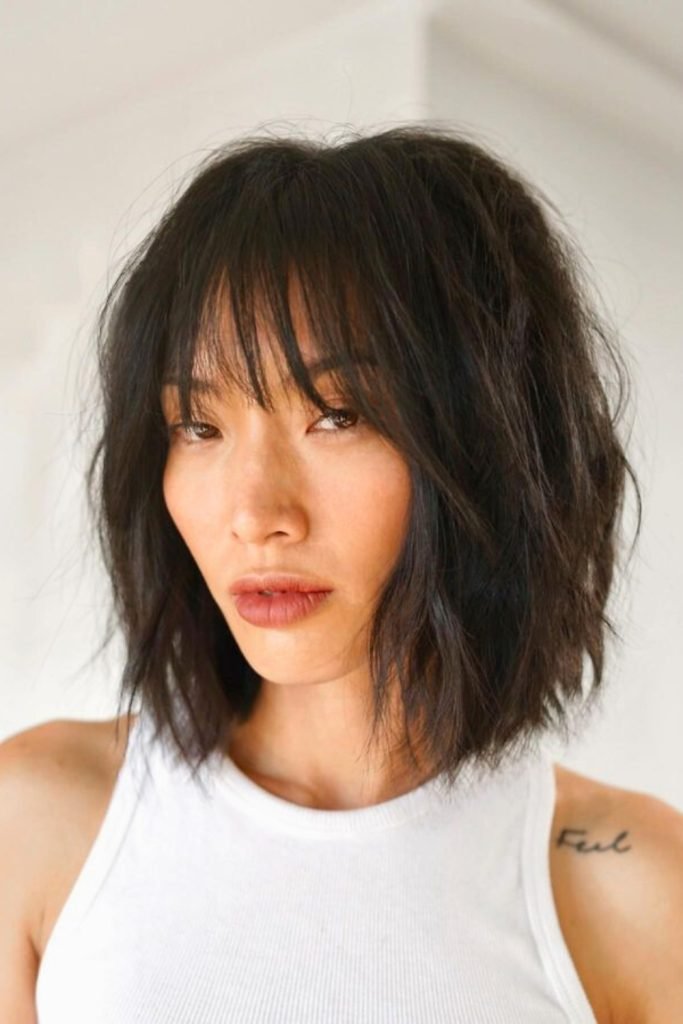 This wispy bangs textured lob combines a playful fringe with tousled waves, creating a modern and edgy look.