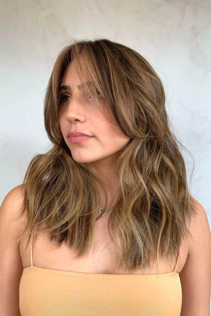 The soft bangs frame the face beautifully, while the textured layers add depth and dimension to the overall style.