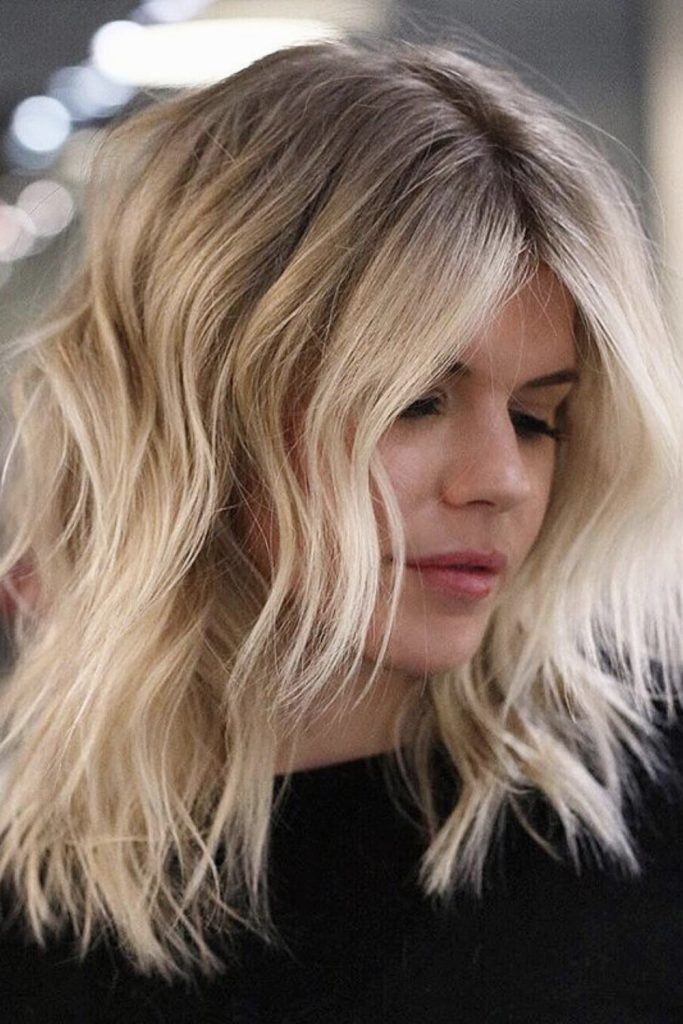 The platinum blonde textured lob exudes a modern, edgy charm. This hairstyle features icy blonde tones that create a striking contrast against the natural roots, adding dimension and depth.