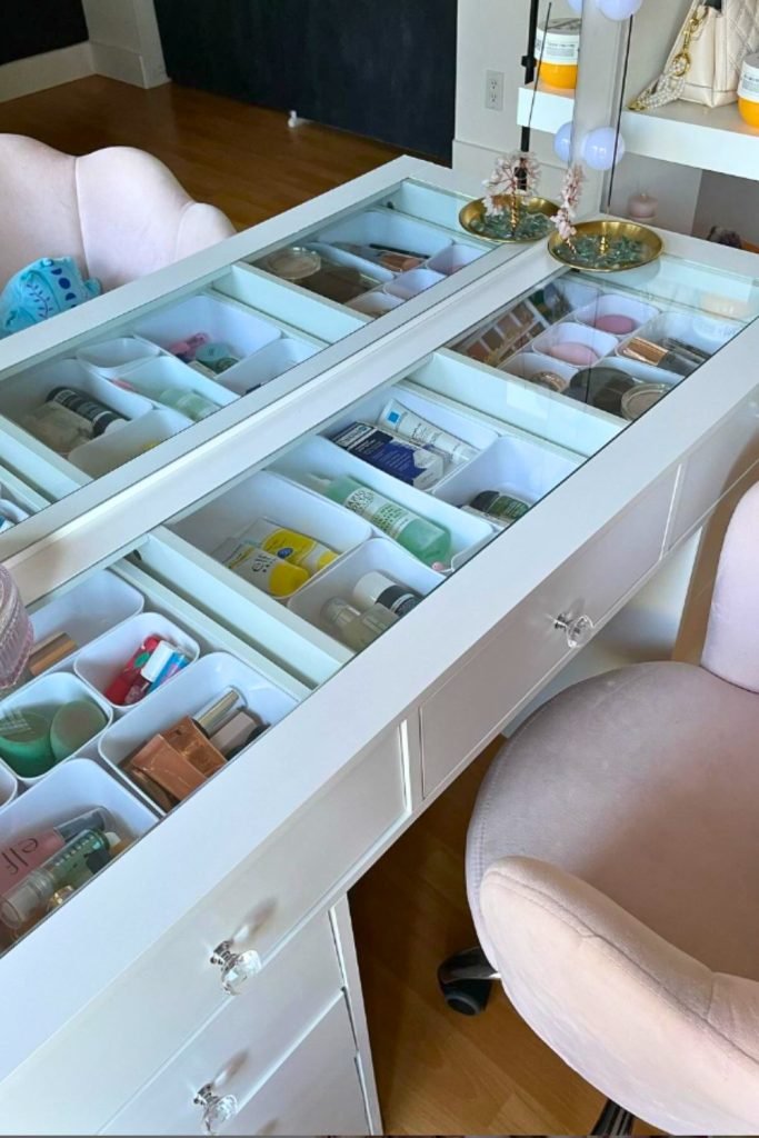 The glass-top desk showcases an organized view of beauty products, while multiple drawers provide ample storage for additional items.