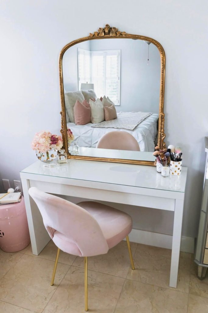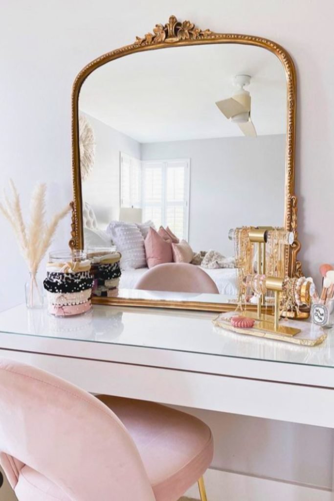 The white desk with a glass top offers a clean, modern look, while the gold-framed mirror adds a touch of vintage glamour.