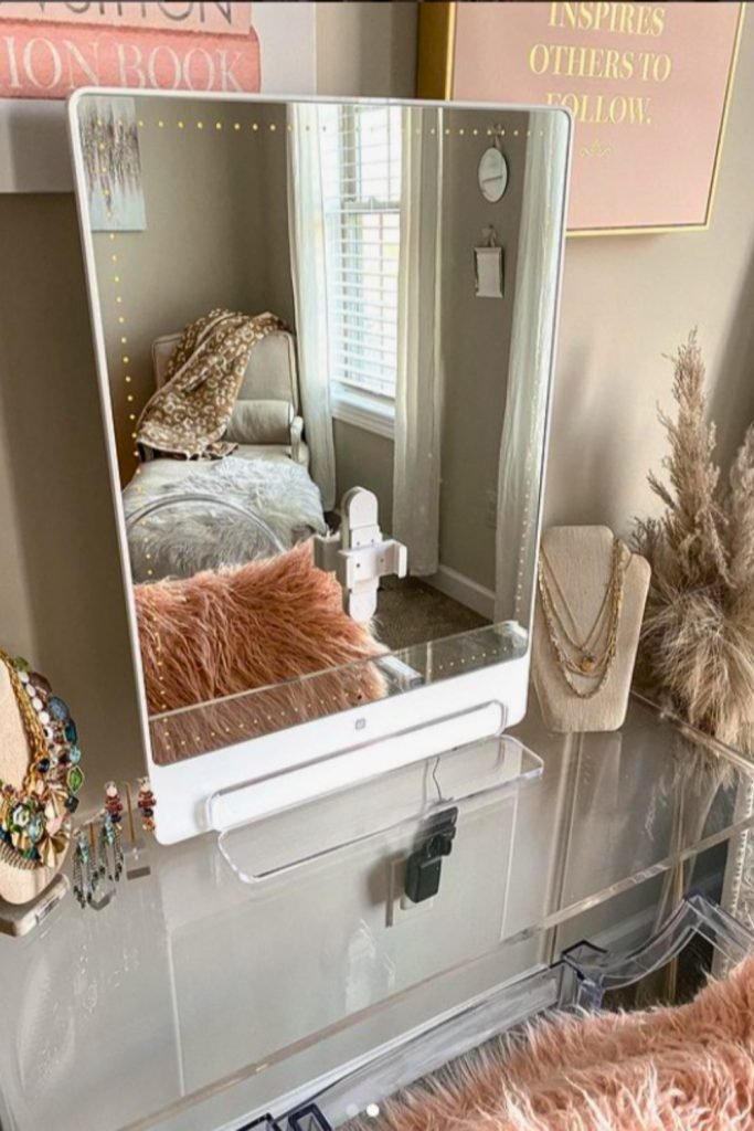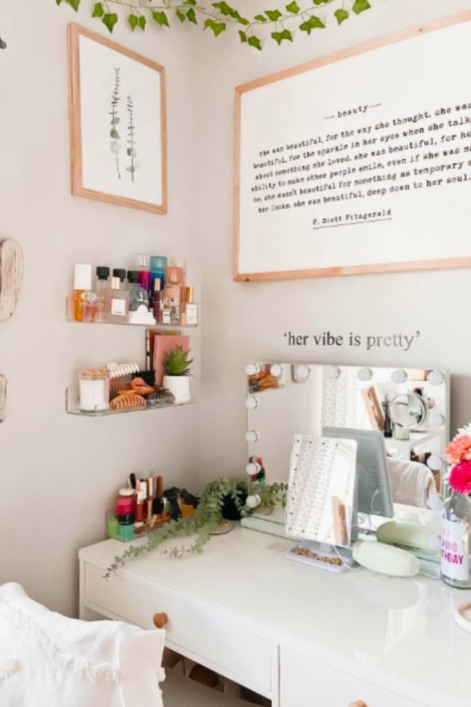 This inspirational and organized vanity corner is both functional and uplifting. The white vanity table with a lighted mirror ensures excellent visibility for makeup application.