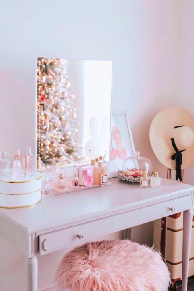 This feminine and festive vanity arrangement is perfect for the holiday season. A lighted mirror illuminates the space, reflecting the festive decorations.