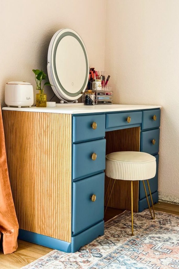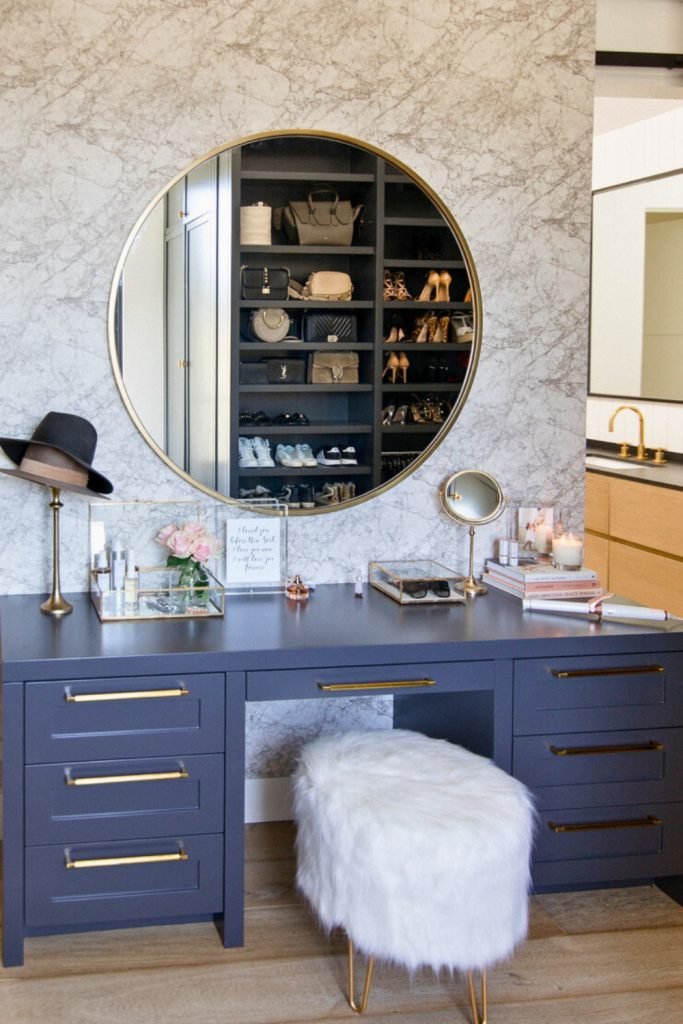 This glamorous and functional vanity design combines luxury with practicality. The striking navy blue desk with gold handles provides ample storage with multiple drawers.