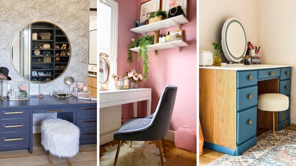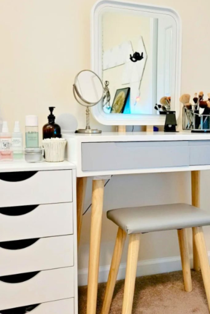 This setup not only maximizes space but also creates a visually appealing and practical beauty station.