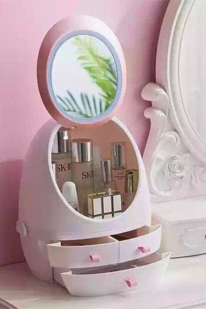 This compact vanity organizer is perfect for small spaces. Featuring a built-in mirror with soft LED lighting, it provides optimal visibility for skincare and makeup applications.