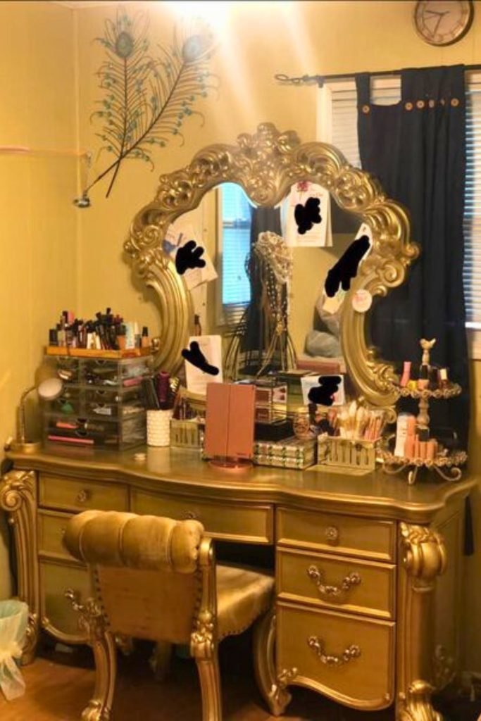 The ornate gold mirror and matching desk create a luxurious focal point, while multiple drawers offer ample storage.