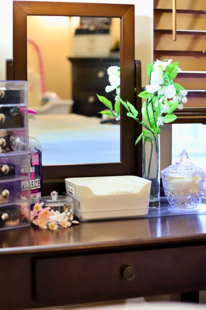 Clear acrylic organizers keep makeup and skincare products neatly arranged, while a delicate vase with faux flowers adds a touch of freshness.