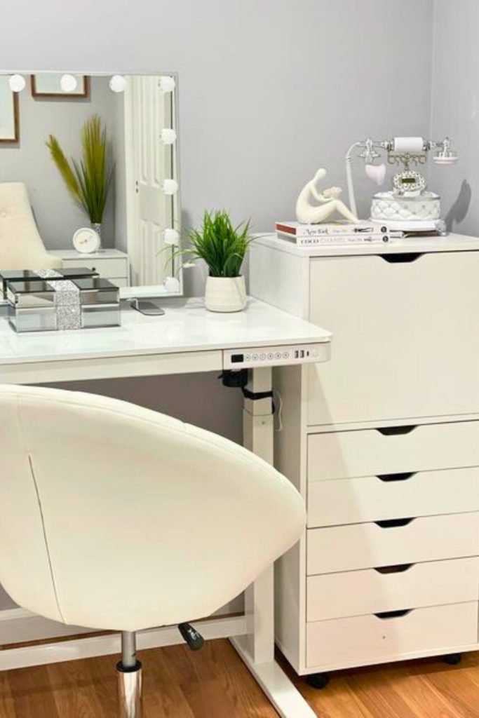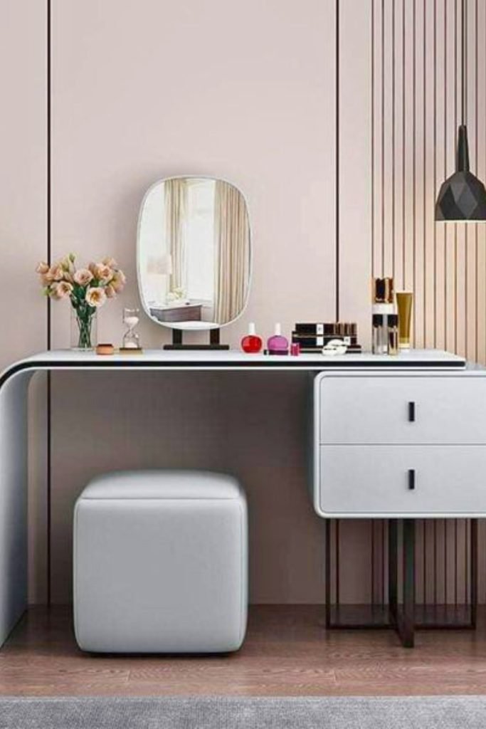 The streamlined desk with rounded edges features a clean, uncluttered surface, perfect for daily beauty routines.