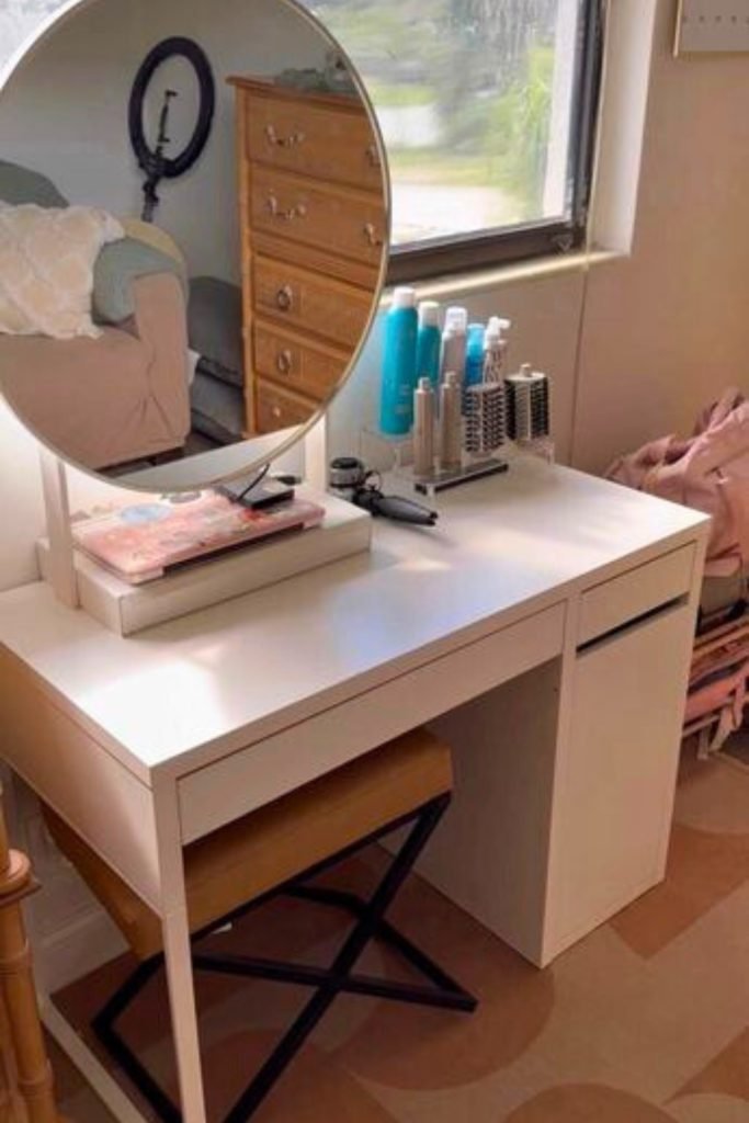 This compact and organized vanity setup maximizes space and efficiency. Featuring a round mirror with a sleek white desk, it offers a clean and modern look.