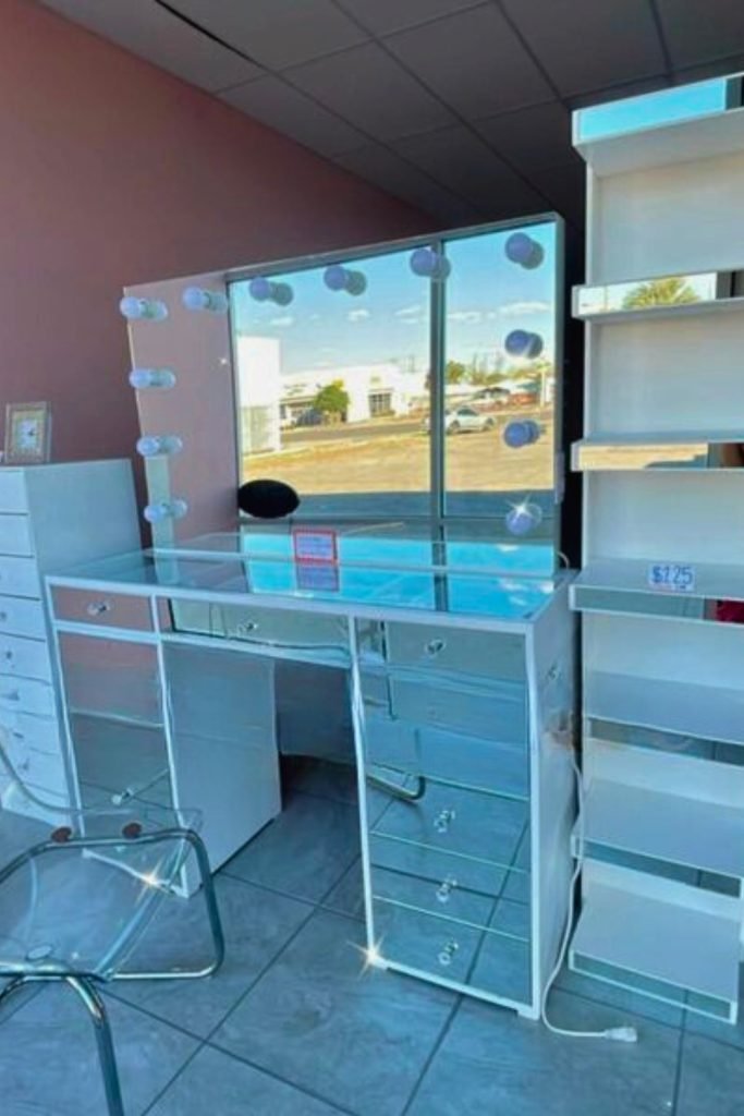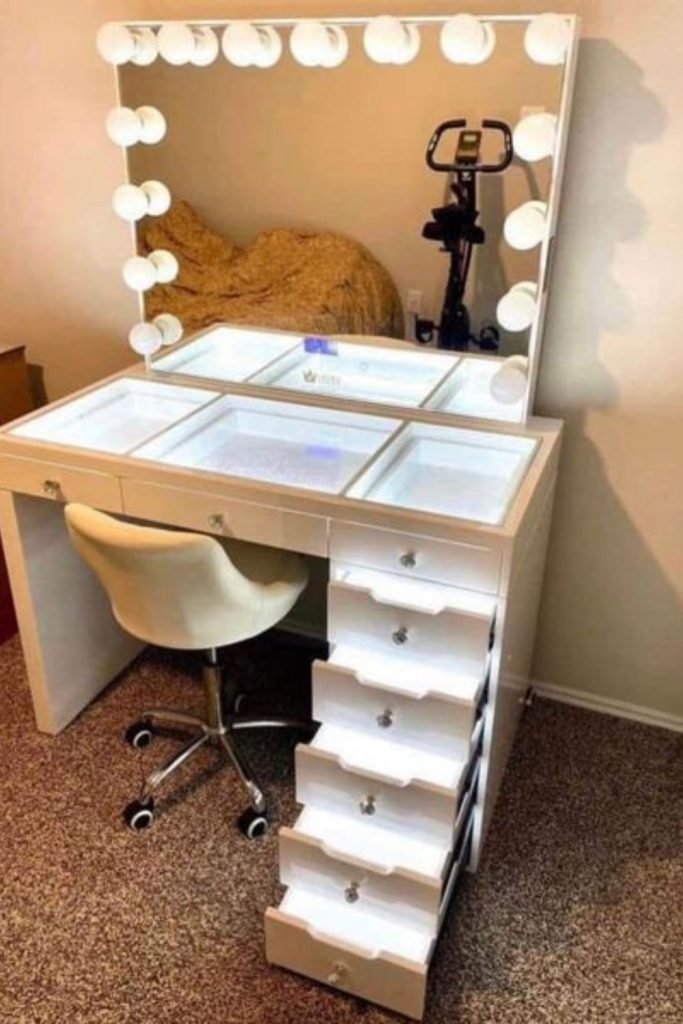 Featuring a spacious mirrored desk and a large mirror framed with bright bulbs, it ensures perfect lighting for makeup application.