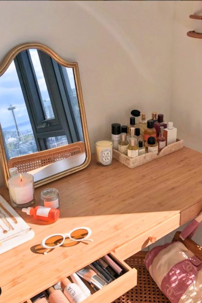 This chic and functional vanity setup combines style and practicality. The bamboo surface is adorned with a gold-framed mirror, enhancing the space’s elegance.