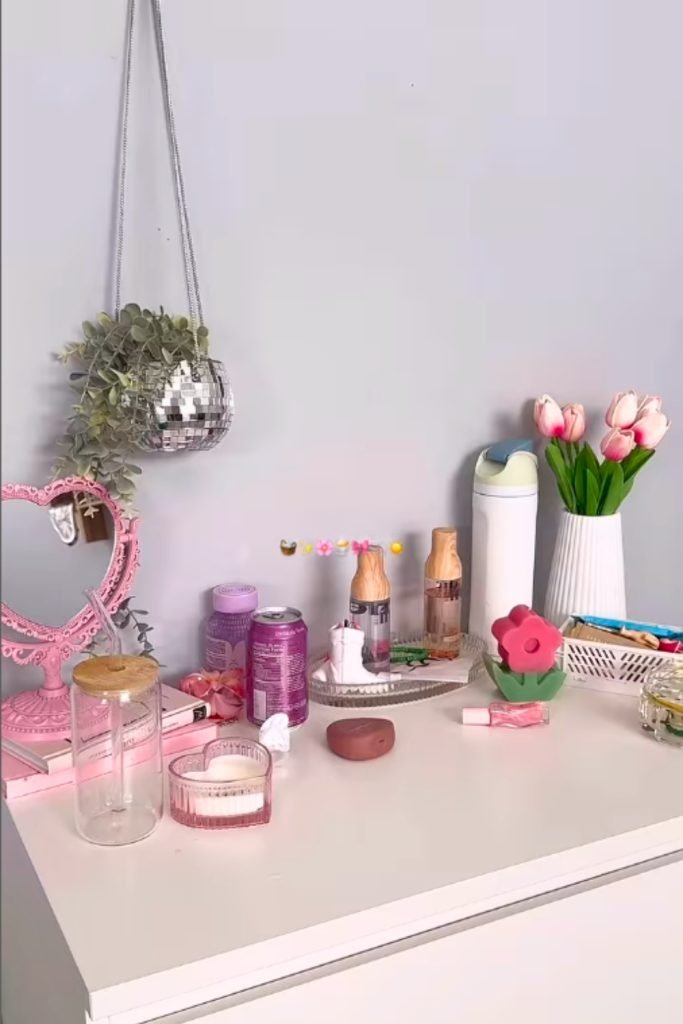 Featuring a mix of practical and decorative items, the setup includes a pink heart-shaped mirror, a hanging disco ball planter, and a variety of skincare products.