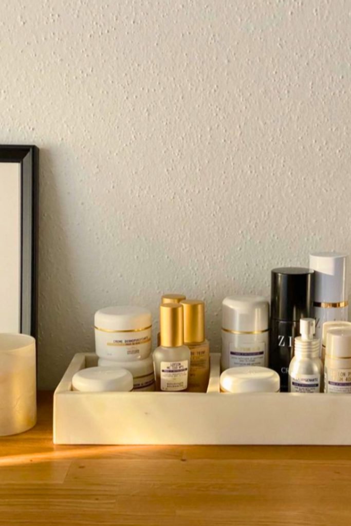 Perfumes and skincare products are neatly organized in a marble tray, creating a clutter-free look.
