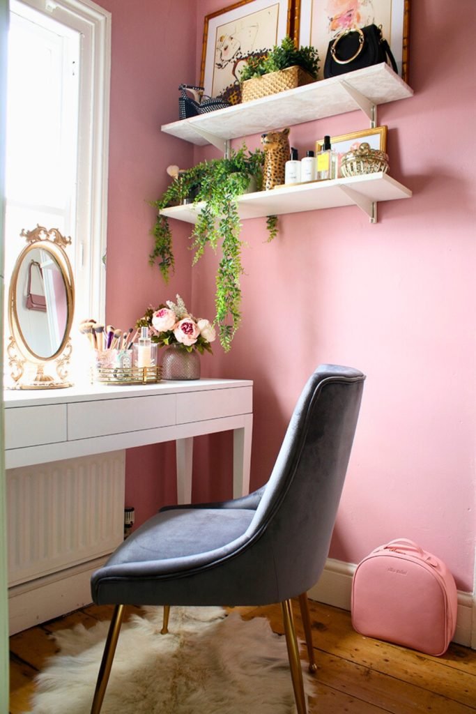 This cozy and chic vanity nook blends comfort with style. Set against a pink wall, the white vanity table features a classic mirror and neatly arranged makeup brushes.
