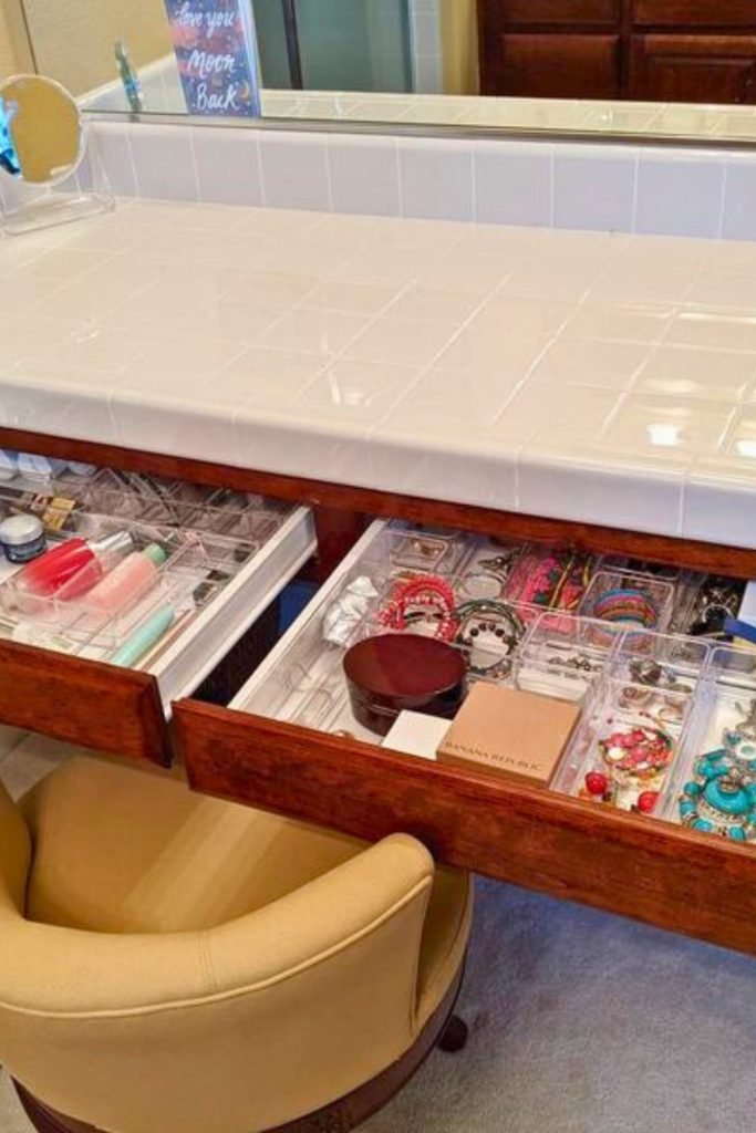 This practical drawer organization system keeps your vanity area tidy and efficient.