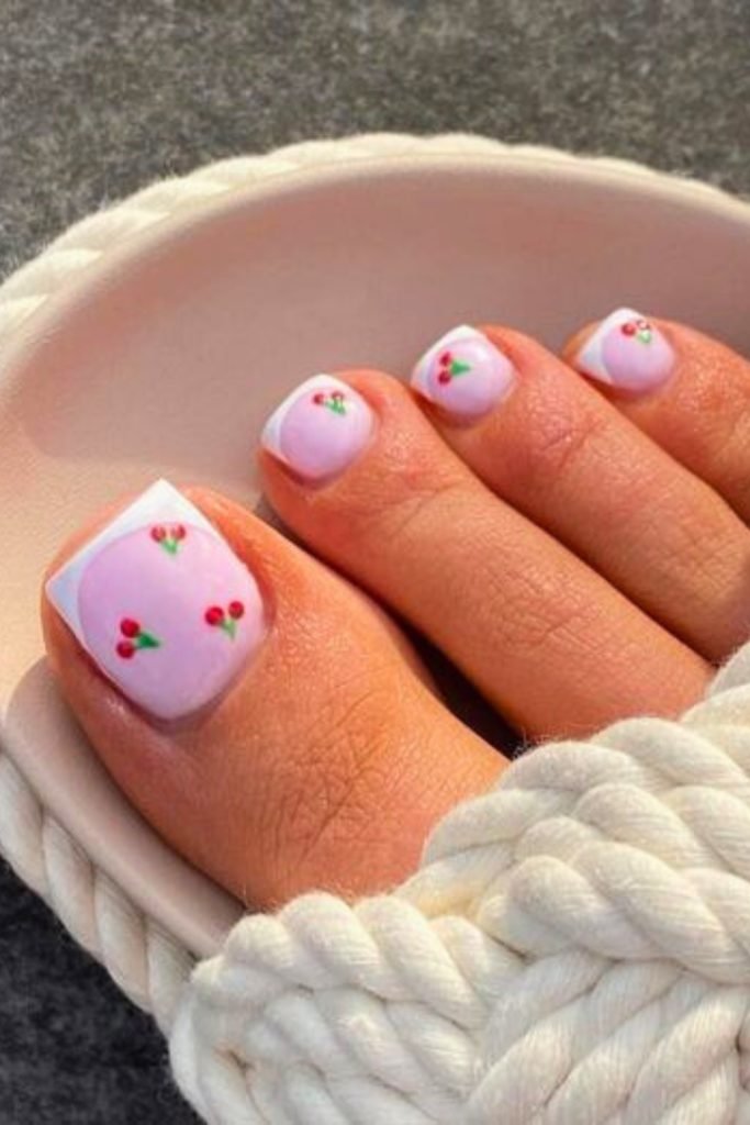 Featuring a soft pink base, each toenail is adorned with tiny, meticulously painted cherries and green leaves, creating a sweet and playful look.