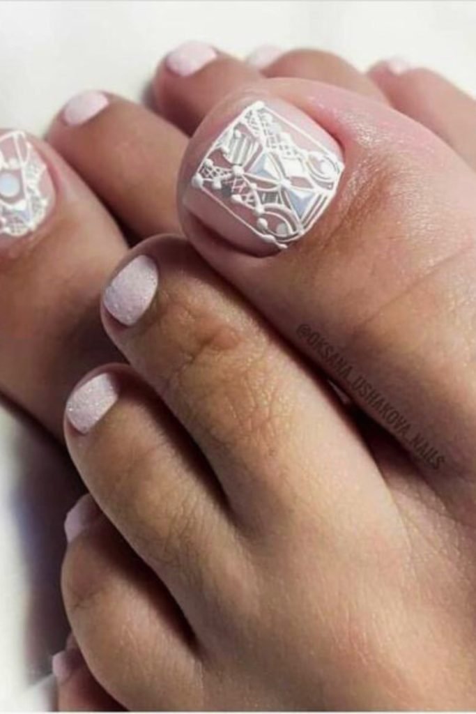 This design transforms your toes into a canvas of elegance with detailed white lace patterns adorning the prominent nails.