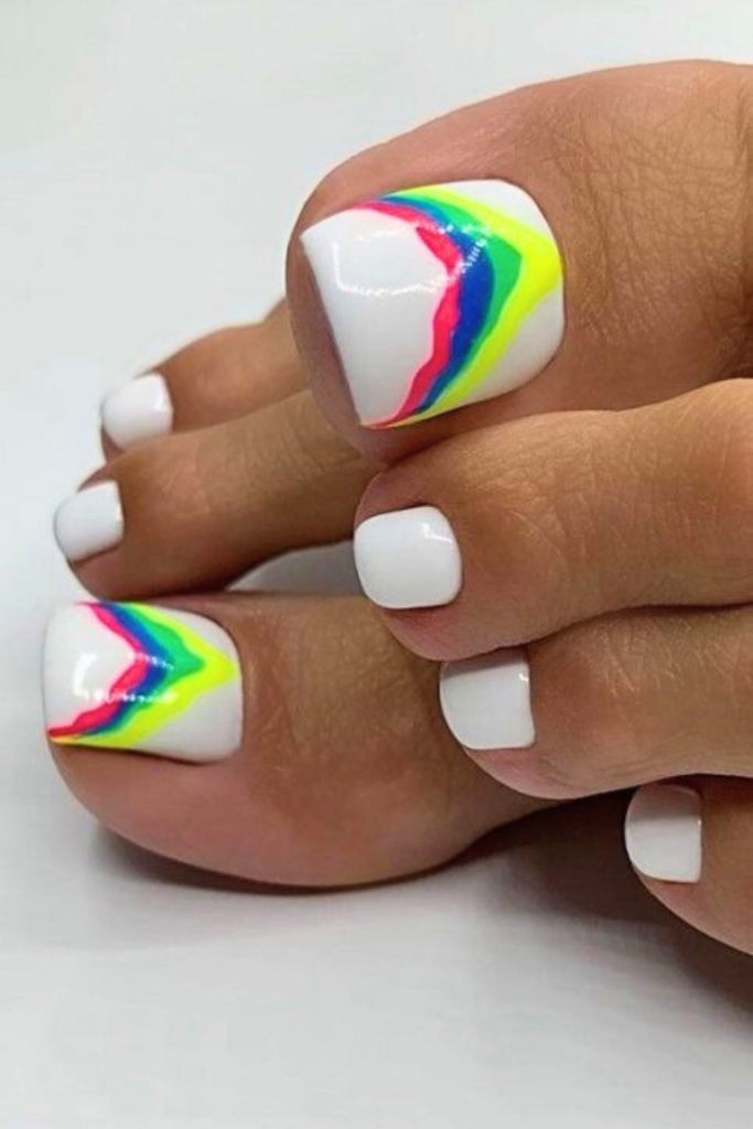 This design starts with a clean, crisp white polish that serves as a perfect canvas. The real magic happens with the addition of vibrant neon streaks on the big toenails.