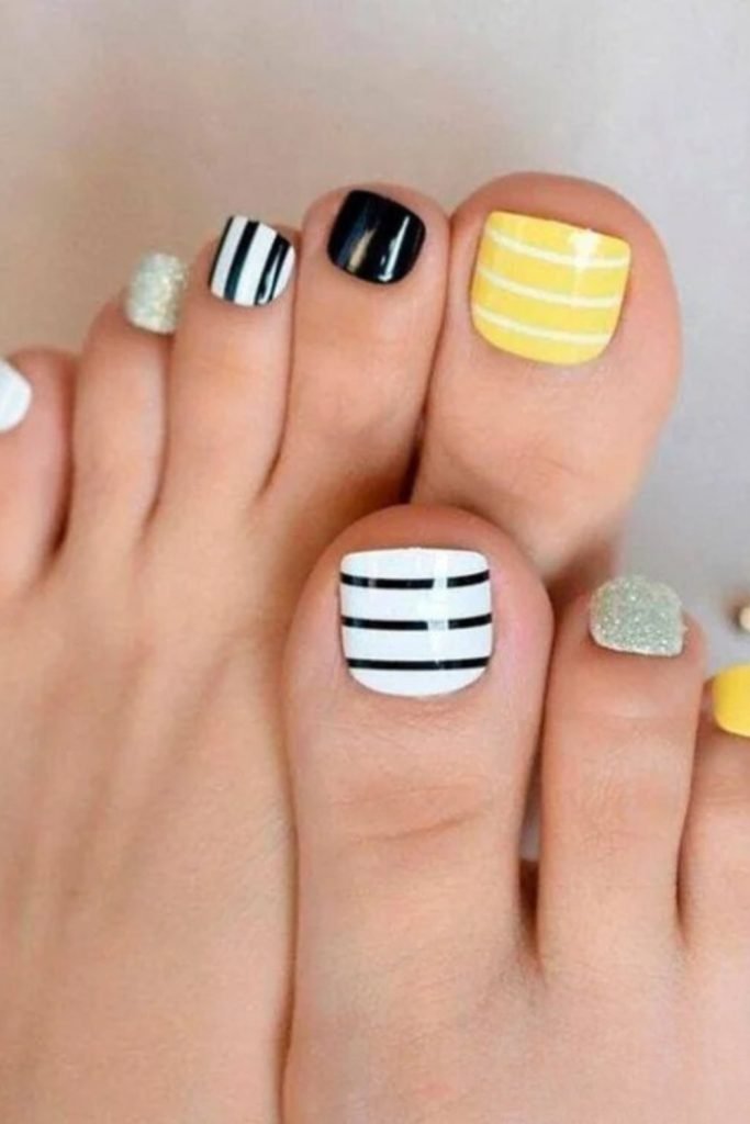 From the shimmering allure of glittery nails to the sleek sophistication of solid black, and the eye-catching impact of black and white or yellow stripes, this pedicure is anything but ordinary.