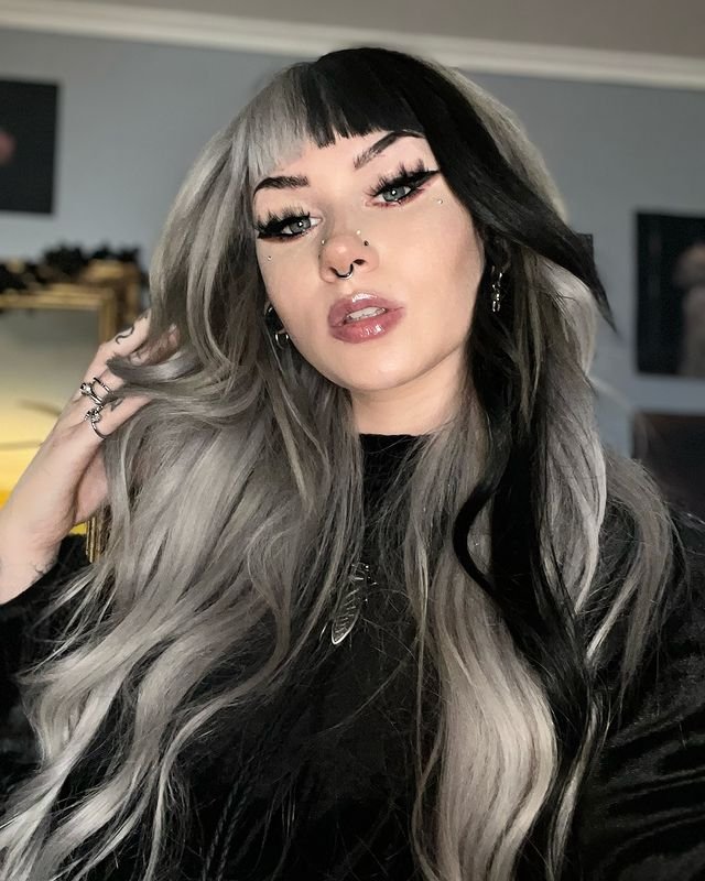 The blend of dark and light creates an enchanting and ethereal effect. To achieve this look, start by dyeing half of your hair black and the other half silver or platinum. Use a large barrel curling iron to create loose, voluminous waves.