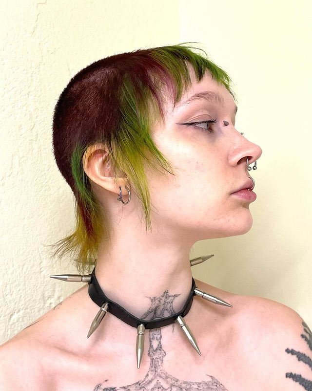 Achieving this requires shaving the sides short while leaving a slight fringe to dye the green sections. It’s a low-maintenance style but packs a powerful punch.