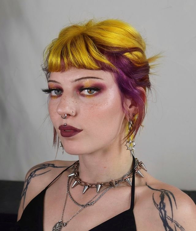 The two-tone color gives a mystical, otherworldly vibe. To achieve this look, bleach the hair before applying yellow on top and purple on the bottom sections.