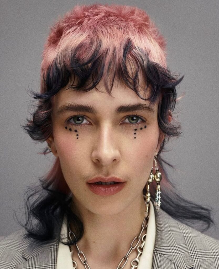 Add pastel dye to the top while keeping the roots dark to maintain that contrasting effect. This hairstyle’s edginess works perfectly with bold makeup, like sharp eyeliner or face tattoos, adding a modern, witchy twist to your look.