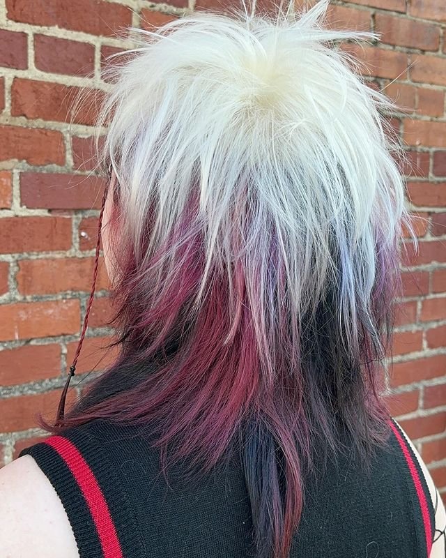 This layered mullet combines white platinum with deep purple hues for a bold, witchy effect. The hair is styled in shaggy layers, with a messy, textured cut that adds volume and dimension.