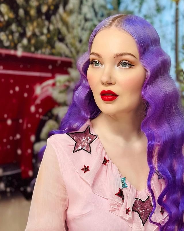This lilac mermaid wave hairstyle radiates mystical and magical vibes, perfect for a witchy aesthetic. The hair is dyed in a soft, enchanting lilac shade, and styled in deep, sculpted waves that flow elegantly down.