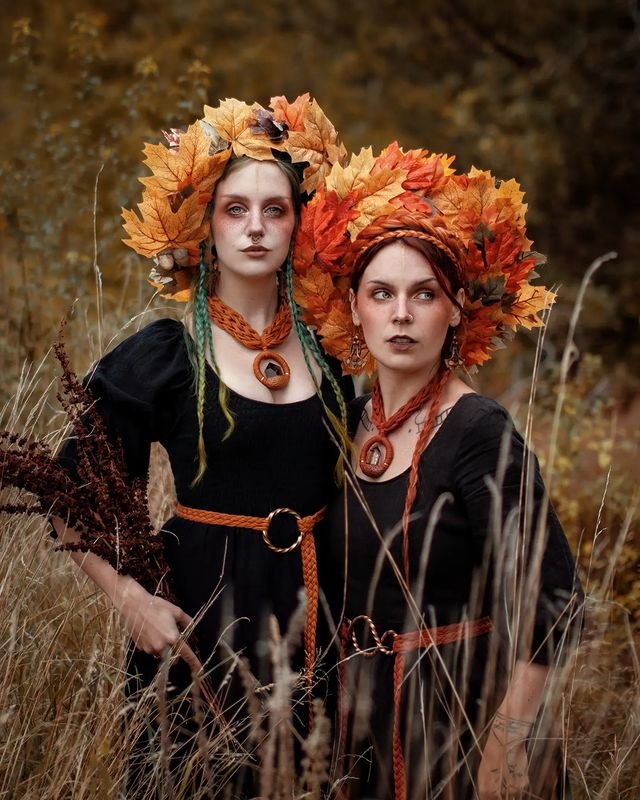 This autumn-inspired witchy hairstyle features elaborate leaf crowns paired with simple braided hair. The hair is styled into twin braids on either side, with large autumn leaf crowns adorning the top of the head.