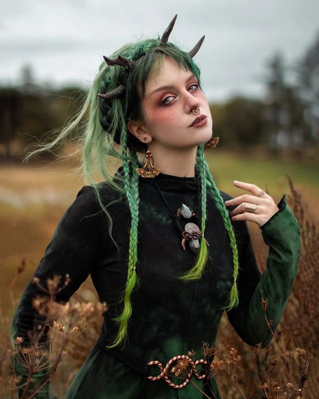 To get this look, braid the hair into two long sections, leaving some green strands out for extra texture. Attach small faux horns to the crown of the head for a more powerful witchy vibe.