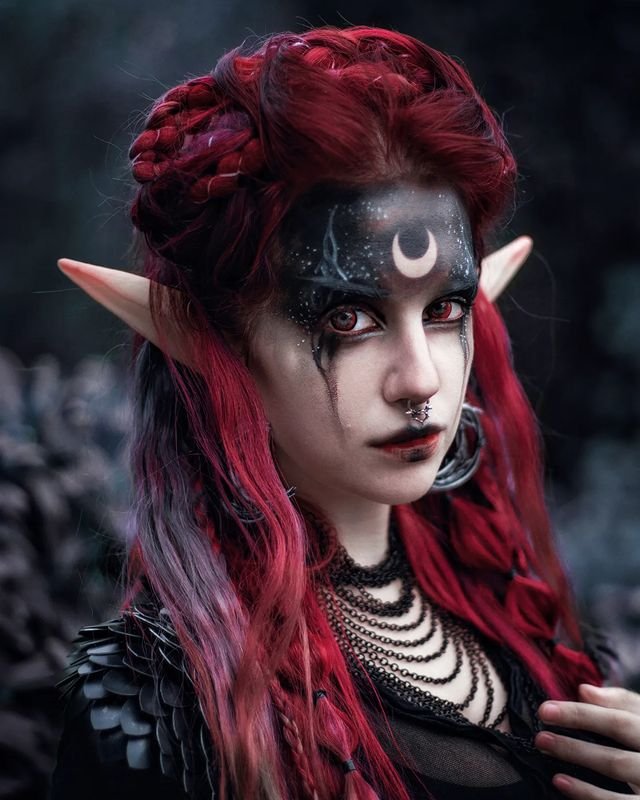 The combination of braids and accessories like pointed ears and chains intensifies the dark witch aesthetic, ideal for ritualistic or gothic-inspired themes.