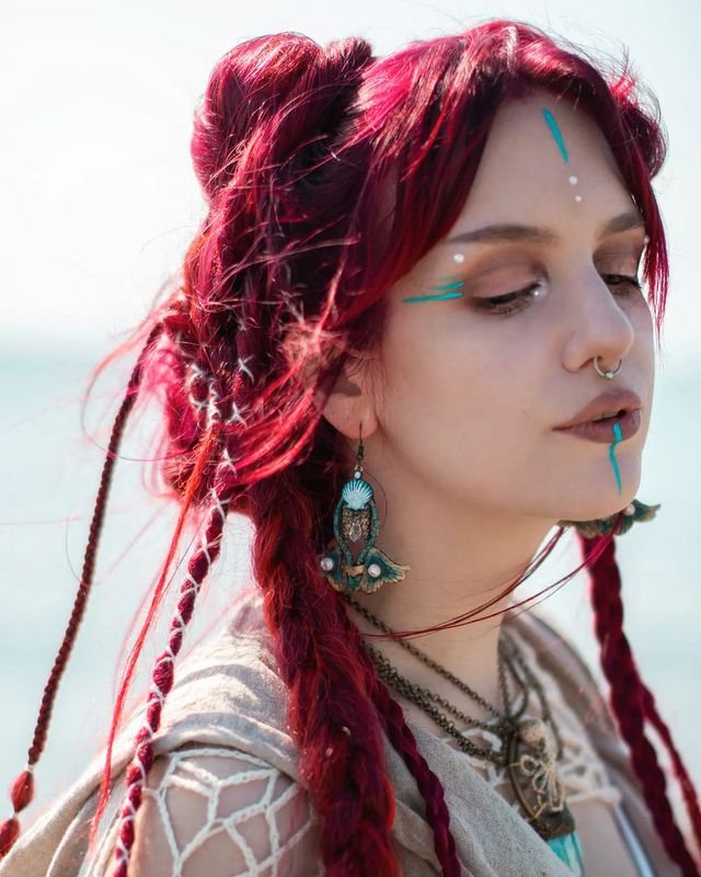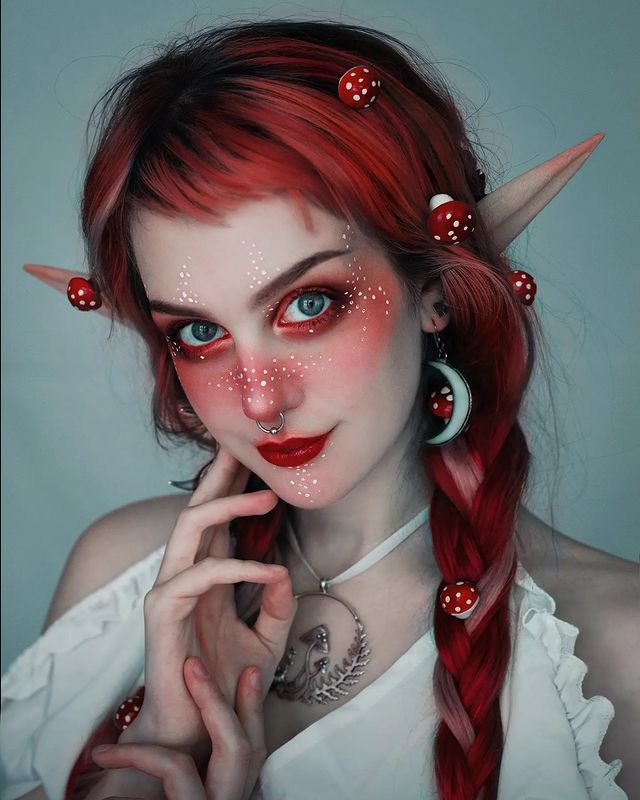 To recreate this style, dye the hair a deep crimson red, then braid the lengths loosely, leaving space for decorative mushrooms. Complete the look with pointed ears and minimal face paint for a soft, fairy-tale-like witchy vibe.