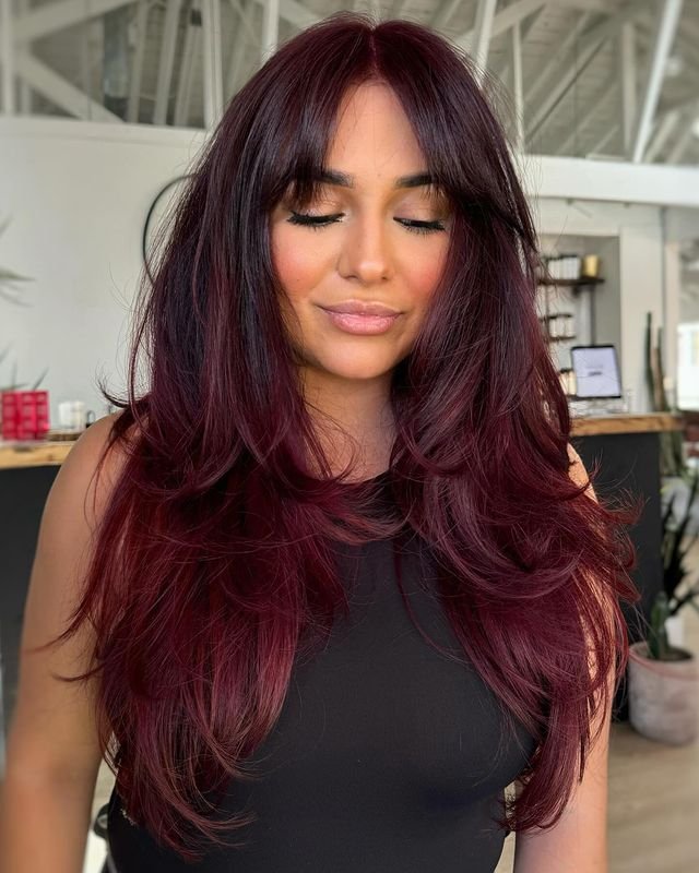 17. Deep Burgundy Witchy Layers with Curtain Bangs
