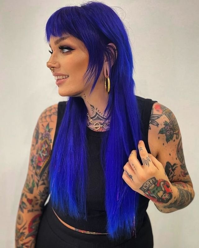 Channel a bold, electric blue witchy energy with this edgy mullet cut. The hair is dyed in a vibrant blue hue, with shorter layers on top and longer lengths at the back, creating the signature mullet shape.