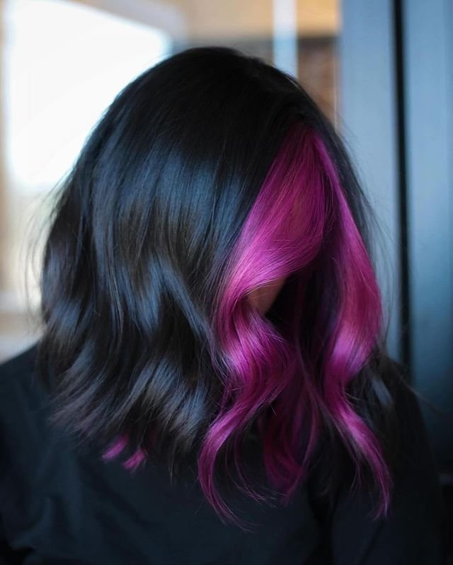 This dark, wavy hairstyle with a bold magenta money piece in the front is a perfect way to add a witchy twist to traditional dark hair. The hair is a rich, glossy black with a vivid magenta section in the front that creates a stunning contrast.