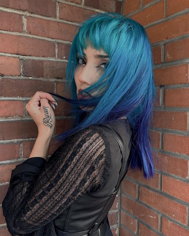 This sea witch-inspired turquoise ombre hairstyle features a stunning gradient from dark blue roots to a vibrant turquoise at the tips. The straight-cut bangs add a modern, edgy feel to the look.