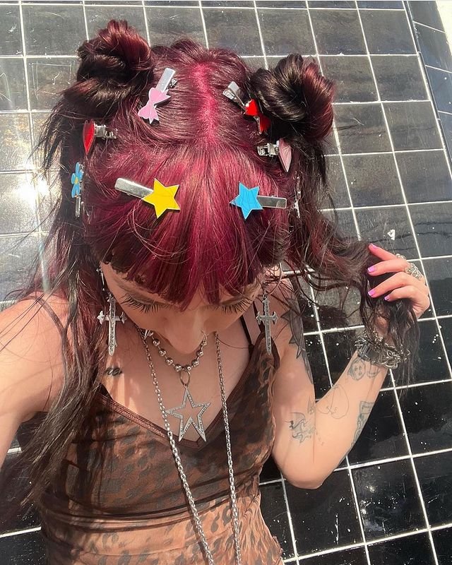 This playful witchy hairstyle features two messy space buns with loose strands, adorned with colorful star and heart clips, giving it a fun and magical vibe. The hair is dyed in a rich burgundy shade with natural dark tones at the ends, adding depth to the overall look.